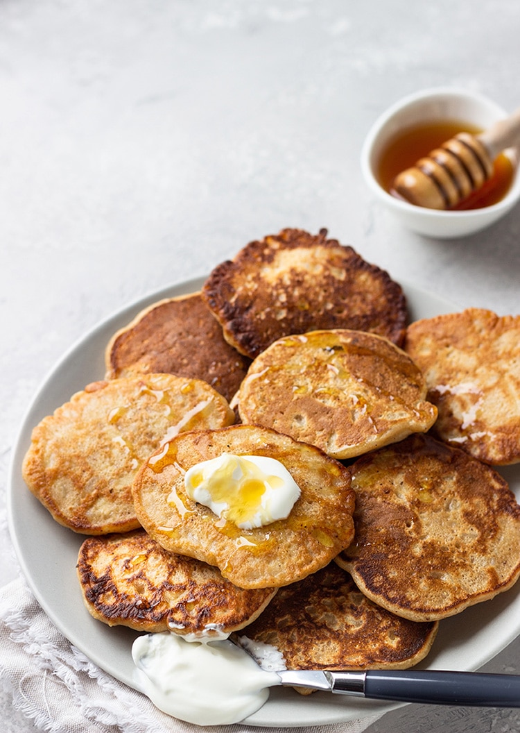 As I mentioned earlier, this recipe freezes wonderfully. I usually put most of one batch in the freezer for meals later on. To freeze, I like to line a sheet pan with parchment paper and layer the pancakes in single layers as they come off the griddle. Let them cool completely and then freeze them on the parchment lined pans. Once frozen, I put them in a large resealable container and they’re ready for quick meals.